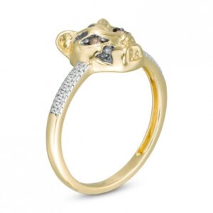 Crafted in warm 10K yellow gold and black rhodium plating, this ring showcases a sculpted cheetah head with captivating champagne diamond eyes and black rhodium plating speckled design. A double row of sparkling white diamonds set in the setting completes the look. With 1/10 carat diamonds and a brilliant polished finish, this ring exudes intense light.