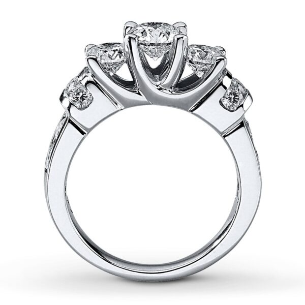 Three round diamonds command attention in the center of this unforgettable ring for her. Additional round diamonds dance on either side for added dazzle. The ring, styled in 14K white gold, has a total diamond weight of 2 1/2 carats. Available online while supplies last. Previously Owned Treasures are not eligible for in-store pick-up. Previously Owned Treasures may only be shipped either to your home address or to an alternate address.