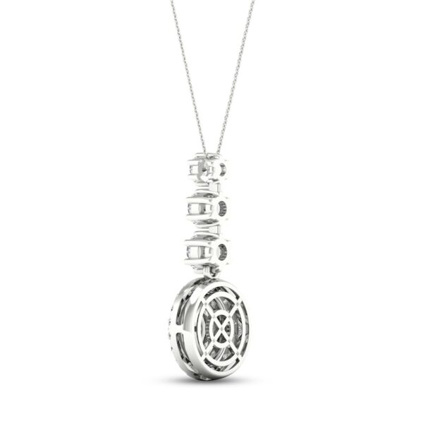 This dazzling necklace showcases a vertical row of three graduating round diamonds suspended over a circular pendant adorned in marquise and round-cut diamonds. Fashioned in 14K white gold, the diamonds total 2 carats in weight. The pendant sways from an 18-inch cable chain that secures with a lobster clasp.